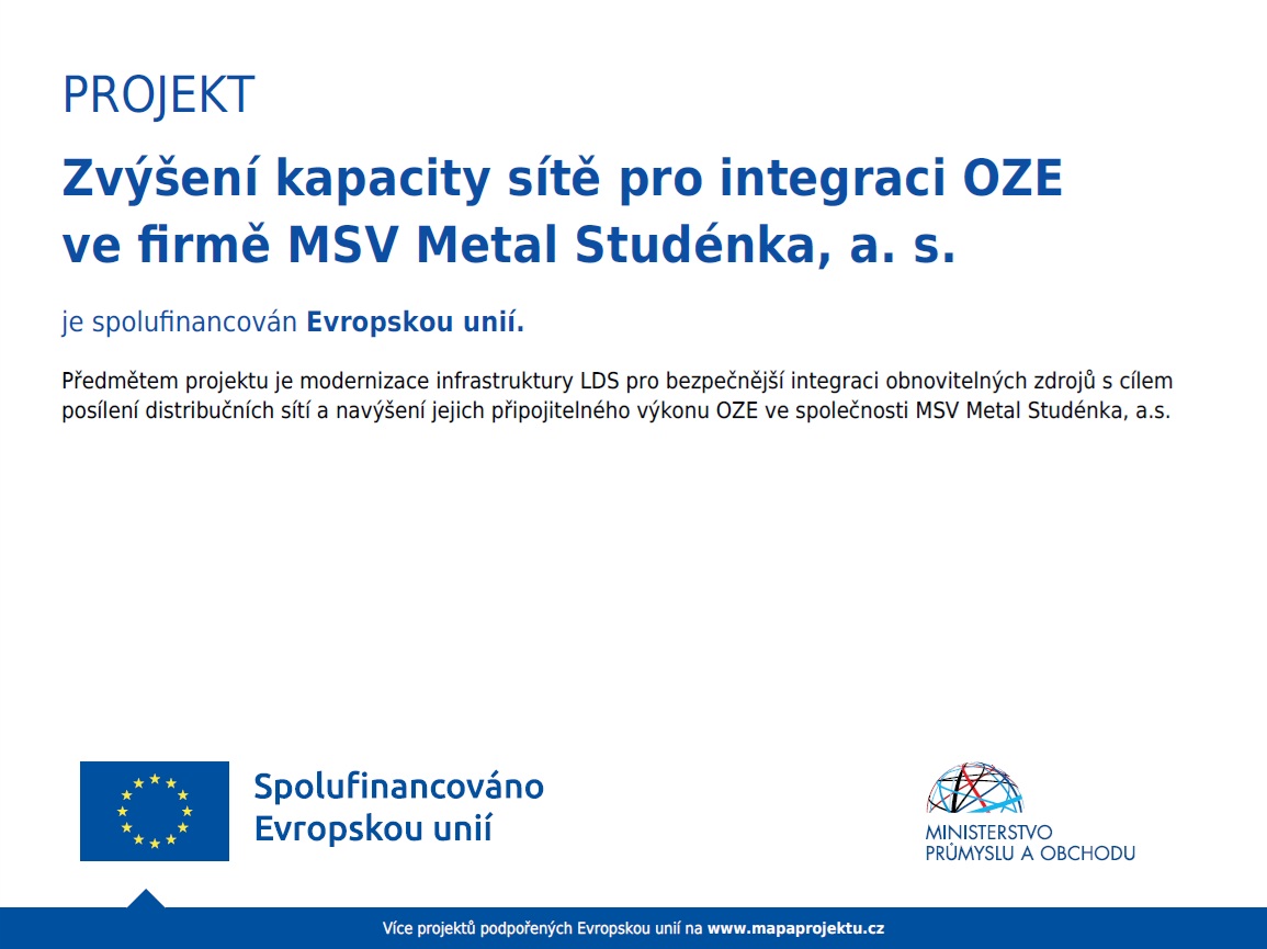 Předmětem projektu je modernizace infrastruktury LDS pro bezpečnější integraci obnovitelných zdrojů s cílem posílení distribučních sítí a navýšení jejich připojitelného výkonu OZE ve společnosti MSV Metal Studénka, a.s.